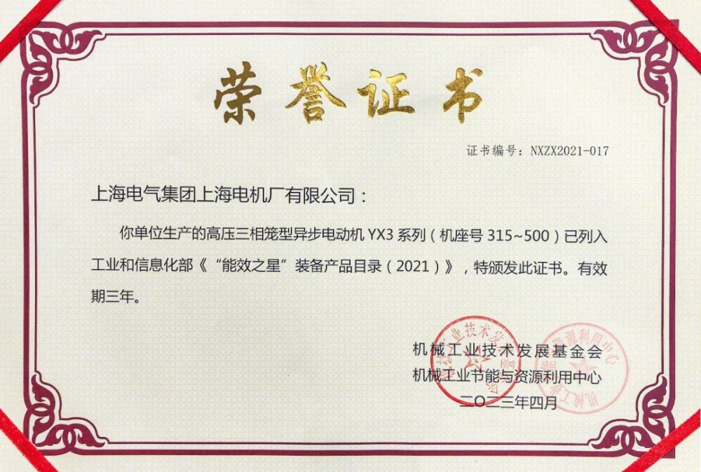 近日,在南京举办的节能服务进企业暨国家工业节能技术装备推广交流会上,上电YX3系列高压三相异步电动机获颁国家“能效之星”装备荣誉证书。
